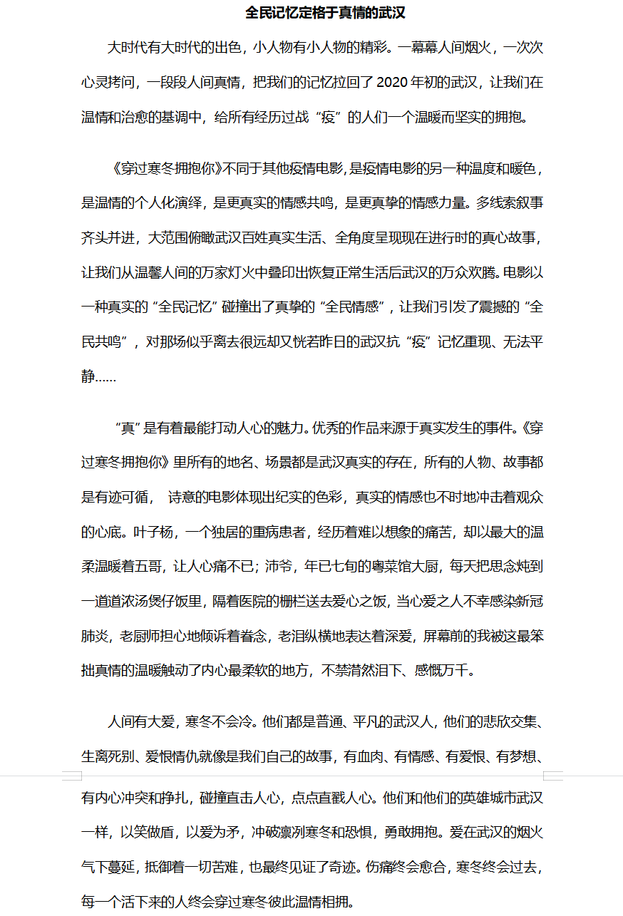 活动持续了两个小时,在观影结束后,许多同学感慨万分,纷纷写下了观后的感悟。同学们写道“泪水与笑脸交织、温暖与感动并存,无数个普通人拼尽全力、守望相助的抗疫情景,深深定格在我们的年度记忆中。”“匆匆疫情三年,让人们懂得了珍惜,懂得了如何去爱,懂得了众志成城。”“伤痛终会愈合,寒冬终将过去,每一个活下来的人终会穿过寒冬彼此温情相拥。”