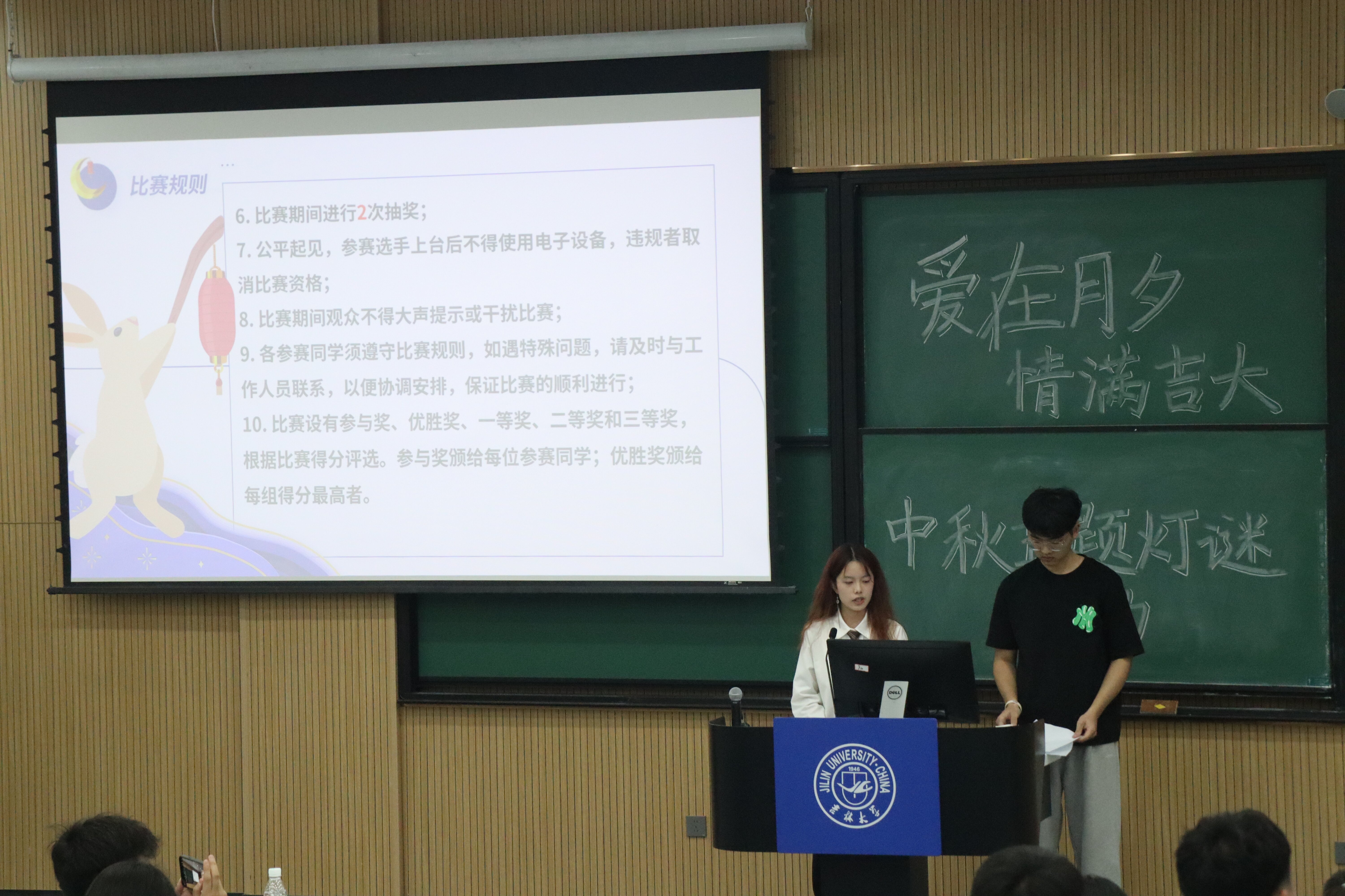 活动当晚,现场迎来了许多前来参加猜灯谜大赛的同学。首先,学生会主席安金阳和宣传部部长彭顺共同为同学们认真讲解了比赛规则。比赛规则如下:现场选出同学参加初赛,共9组,每组6人;初赛每组进行10道灯谜抢答,每组积分第1名为优胜奖进入决赛;决赛9人进行15道灯谜抢答,根据积分决出冠亚季军;比赛期间选手不可使用电子设备,且一名同学只能参赛一次。