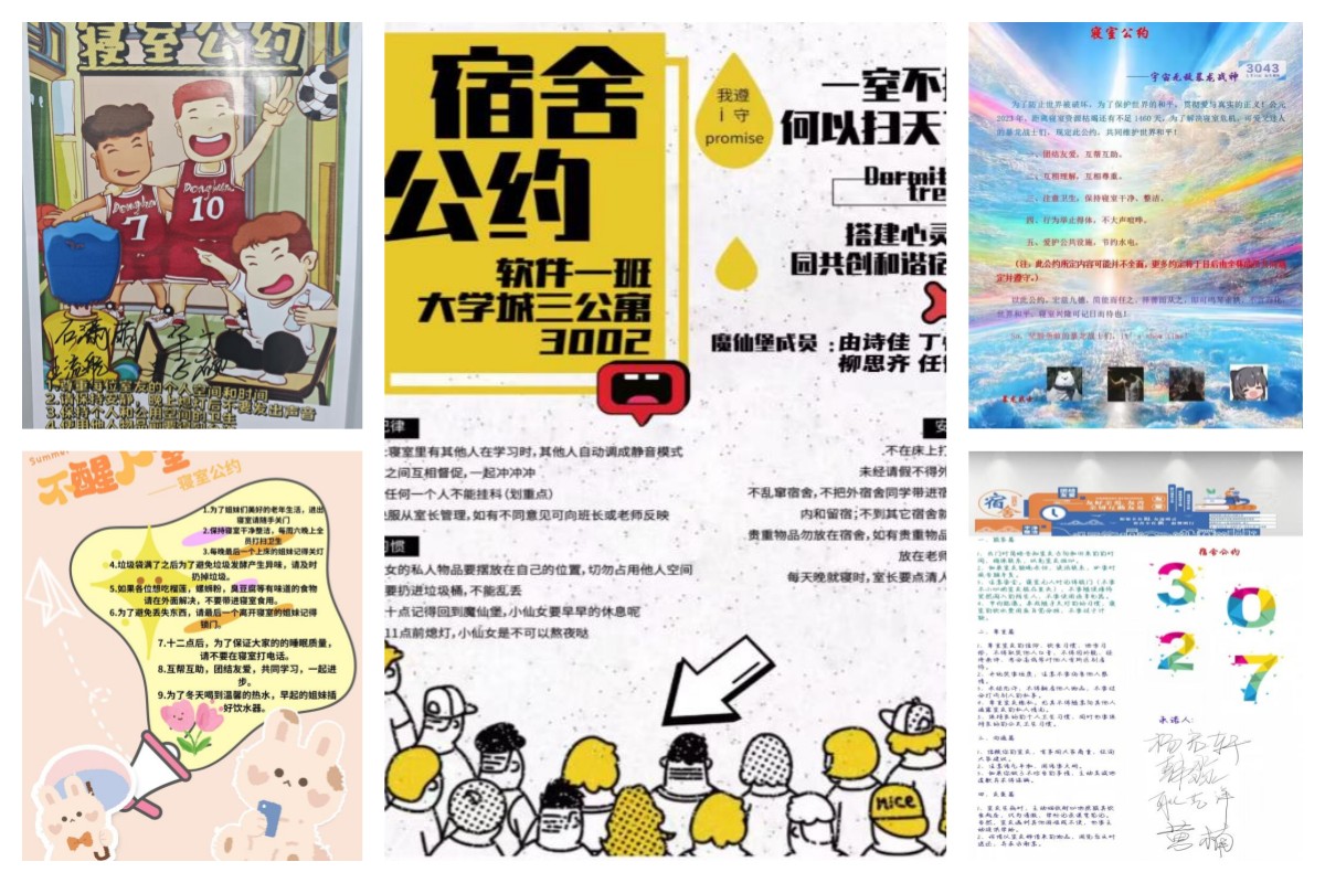 宿舍是同学们在校期间生活和学习的主要场所,来自天南海北的同学们可能有着不同的习惯和性格,干净整洁的环境、和谐温馨的氛围对于同学们体验多彩生活、高效学习工作、培养深厚友谊等具有重要作用。宿舍公约既是每位成员的行为准则,又是展示新时代大学生精神风貌的窗口。本次宿舍文明公约设计活动将文明修身与学生思想政治教育相结合、与校园文化建设相结合,为增进同学之间的相互了解和关怀提供了良好的契机,有利于引导学生加强自我约束、增强集体凝聚力。希望同学们以寝室为家,团结友爱,互帮互助,提升规范意识和责任意识,严格遵守寝室公约,共同营造安全健康、和谐温馨的宿舍文化氛围。