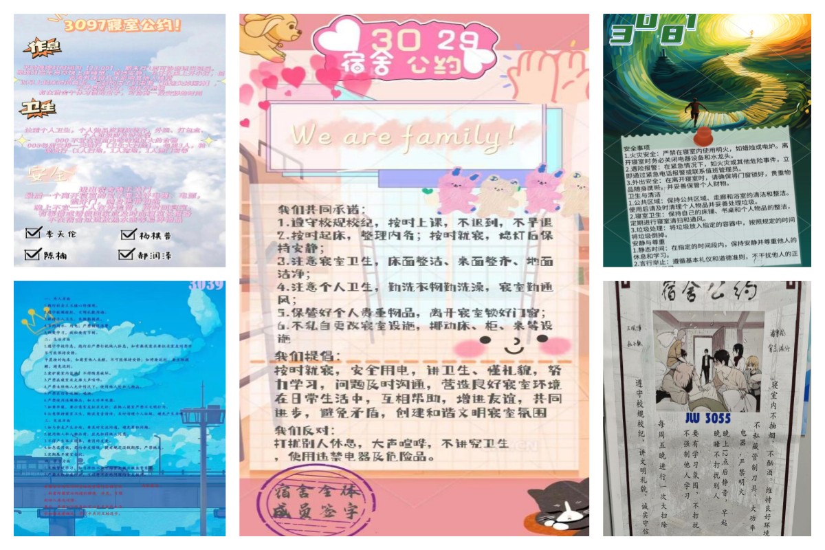 2023级全体同学,以宿舍为单位设计宿舍文明公约并以海报的形式进行呈现,海报内容要求积极向上,必须包括寝室公约内容、宿舍名称、宿舍全体成员姓名等信息。同学们运用专业技能,从安全用电、卫生环境、作息习惯、相处方式等方面提出了关于宿舍文明的倡议并达成内部共识。投稿作品条理清晰,样式美观,特色鲜明、风格多样,充满个性创意的设计风格展现出大学生宿舍的文化和风采。最终学生会生活学习部从投稿作品中评选出优秀作品进行发布,得到了热烈的反响和积极的评价。