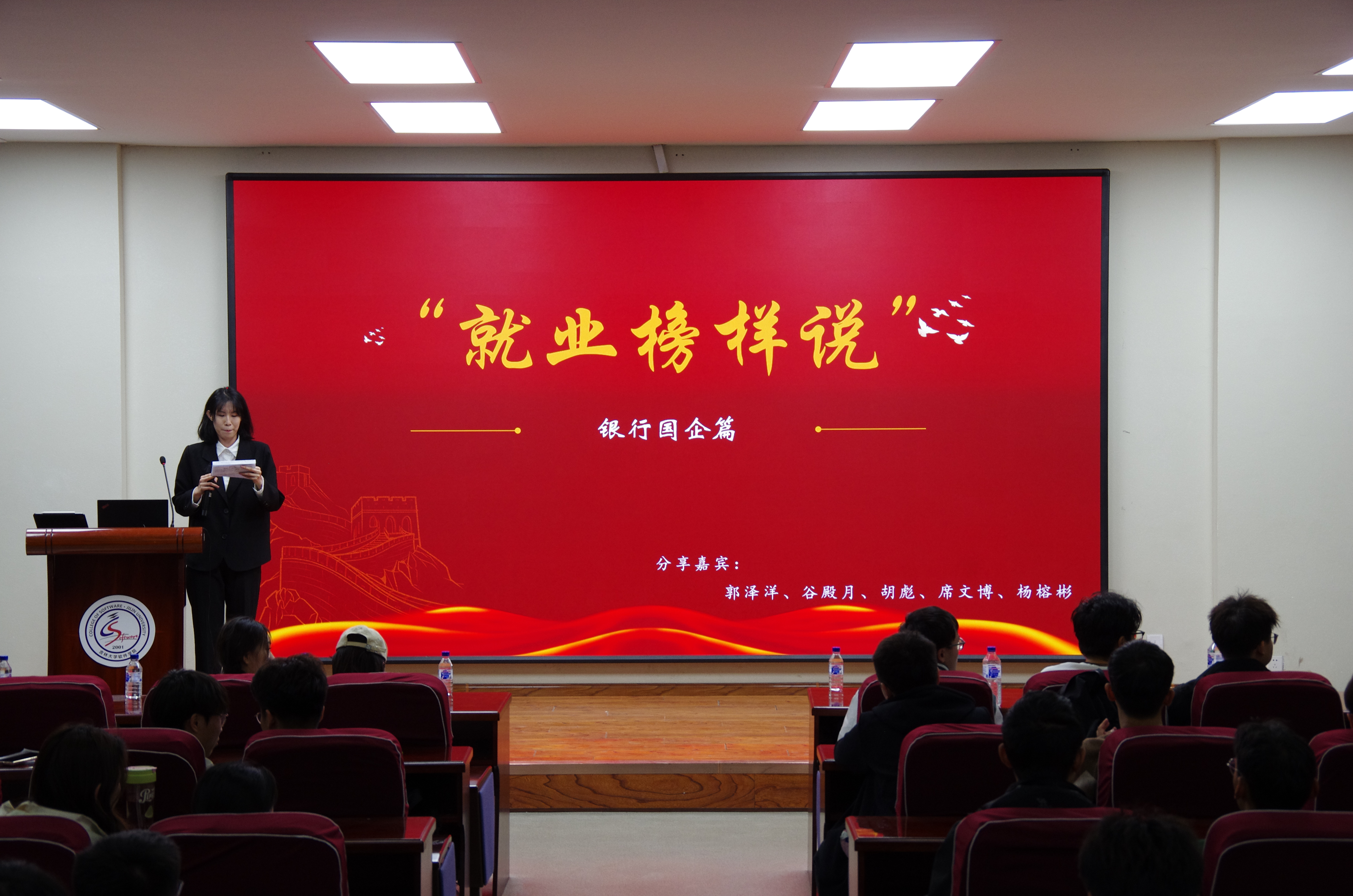 研究生会学生服务部的刘乃宁同学主持,第一位分享嘉宾是现入职中车青岛四方机车车辆有限公司的郭泽洋同学,他聚焦于系统性介绍全国央企的具体行业,深度探讨了针对不同目标单位的学习策略与准备要点;入职黑龙江农业发展银行的谷殿月同学结合亲身经历,讲述了银行体系和晋升途径,剖析了如何巧妙展示项目经历以提升综合面试表现;接着,胡彪同学以其在华为公司的实习经历和最终入职南瑞继保电气有限公司的历程为切入点,讲解各个企业的福利待遇和工作内容,解答如何衡量与选择多个offer的问题;入职长春光学精密机械与物理研究所的席文博同学介绍了上岸研究所的具体时间轴和必备技能,让同学们对实习和找工作的进度有了更深的了解;最后,入职中国邮政储蓄银行数据中心的杨榕彬同学分享了银行技术部门的招聘信息渠道和笔试面试重点准备内容。五位嘉宾依次分享,倾囊相授,为在座同学勾勒出一幅幅通往国企银行行业成功之路的立体画卷。