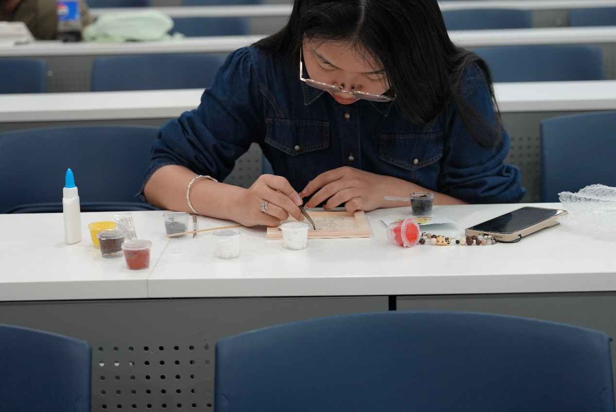 掌握制作方法后,学生们纷纷动手创作。粮食画组的学生们细致构思,将一粒粒色彩各异的谷物巧妙拼接,勾勒出星空、卡通形象等灵动画面,让平凡的粮食焕发出别样的艺术生机。纸浆画组的学生们以手为笔、以浆为墨,在画板上层层铺浆塑形,创作出栩栩如生的花卉、意境悠远的山峦等作品,尽显巧思。三个小时的创作过程中,现场氛围安静温馨、秩序井然,大家沉浸在手工乐趣中,在动手实践中感受传统技艺之美、体悟环保理念。