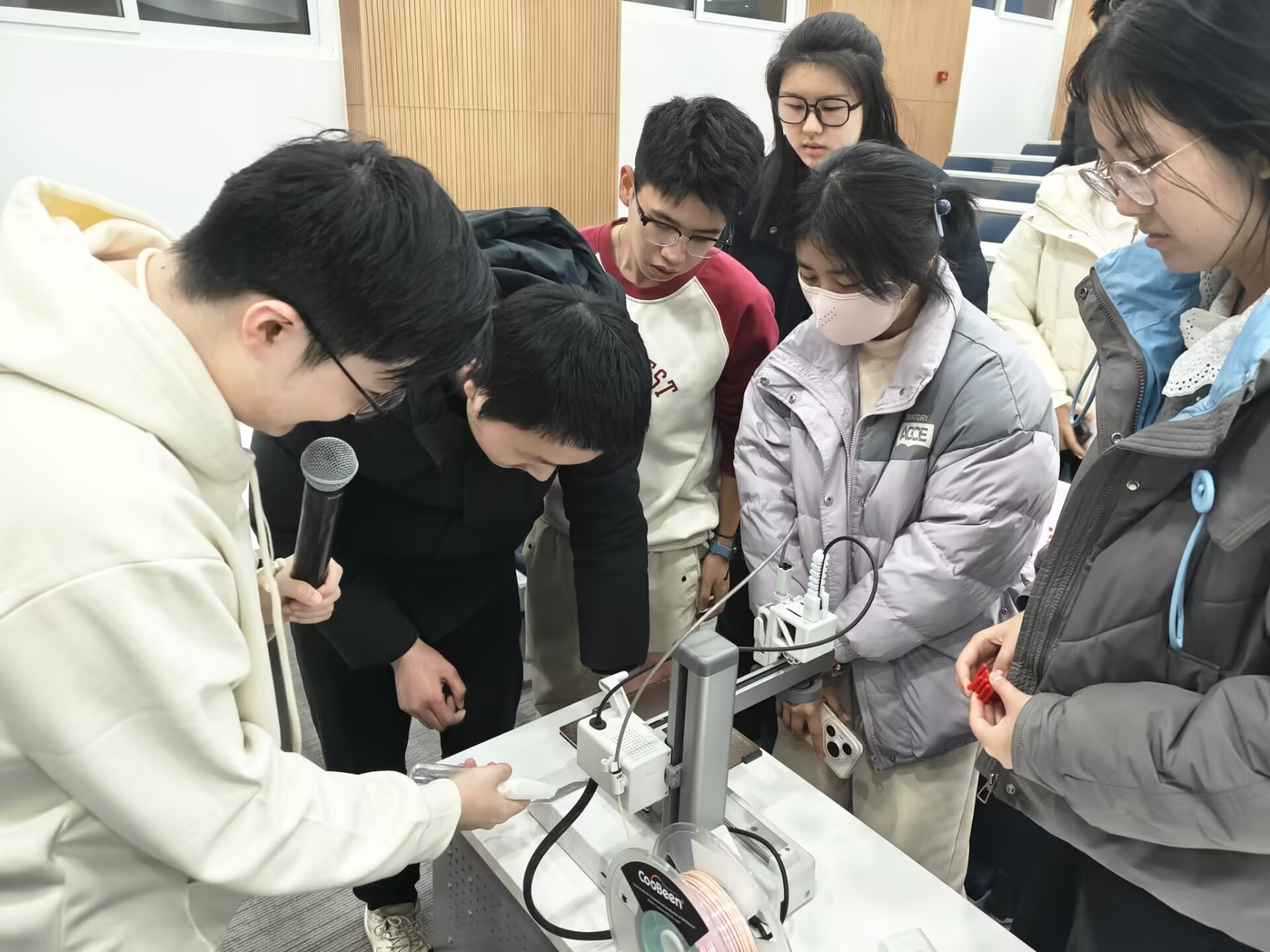 在互动提问环节,同学们踊跃发言,围绕操作技巧等问题积极请教,王福峥逐一耐心答疑解惑,现场交流氛围浓厚,赢得了全体参会同学的一致好评。活动尾声,同学们近距离观摩设备运行细节,上手体验各类3D打印成品,在沉浸式互动中进一步深化了对3D打印技术的理解与感悟。