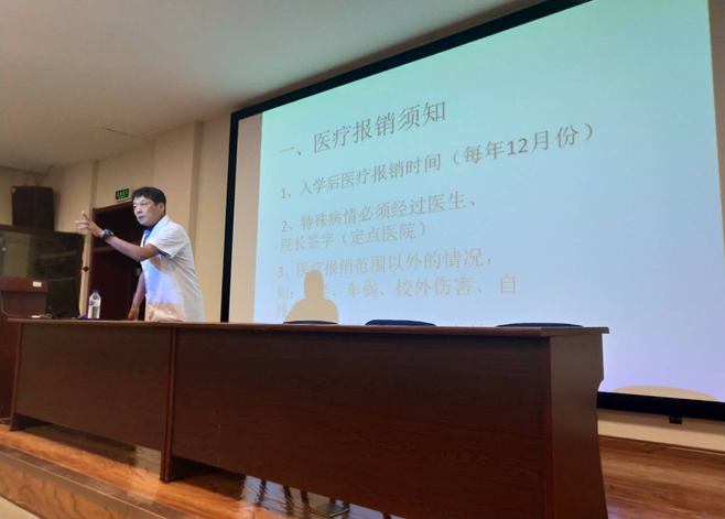 王东升老师向同学们介绍了医疗报销须知,包括入学后医疗报销时间、特殊病情必须经过医生、院长签字以及医疗报销额度等事项。并幽默地为大家举例说明了医疗报销范围以外的情况。着重讲解了健康教育的相关问题,内容涵盖结核病的类型介绍及发病症状、病毒性肝炎乙型的传播条件及治疗方法、食物中毒的防范等。并再三叮嘱同学们,一旦发现自己或他人有类似的病症,一定要及时和校医院沟通并进行医治。随后,王东升老师通过列举往年的患病实例,加深了同学们对这类严重的传染病的认识,强化了同学们对健康教育的重要性的理解。王东升老师幽默风趣的讲解将讲座变得生动有趣,场上时常响起同学们热烈的掌声和阵阵笑声。