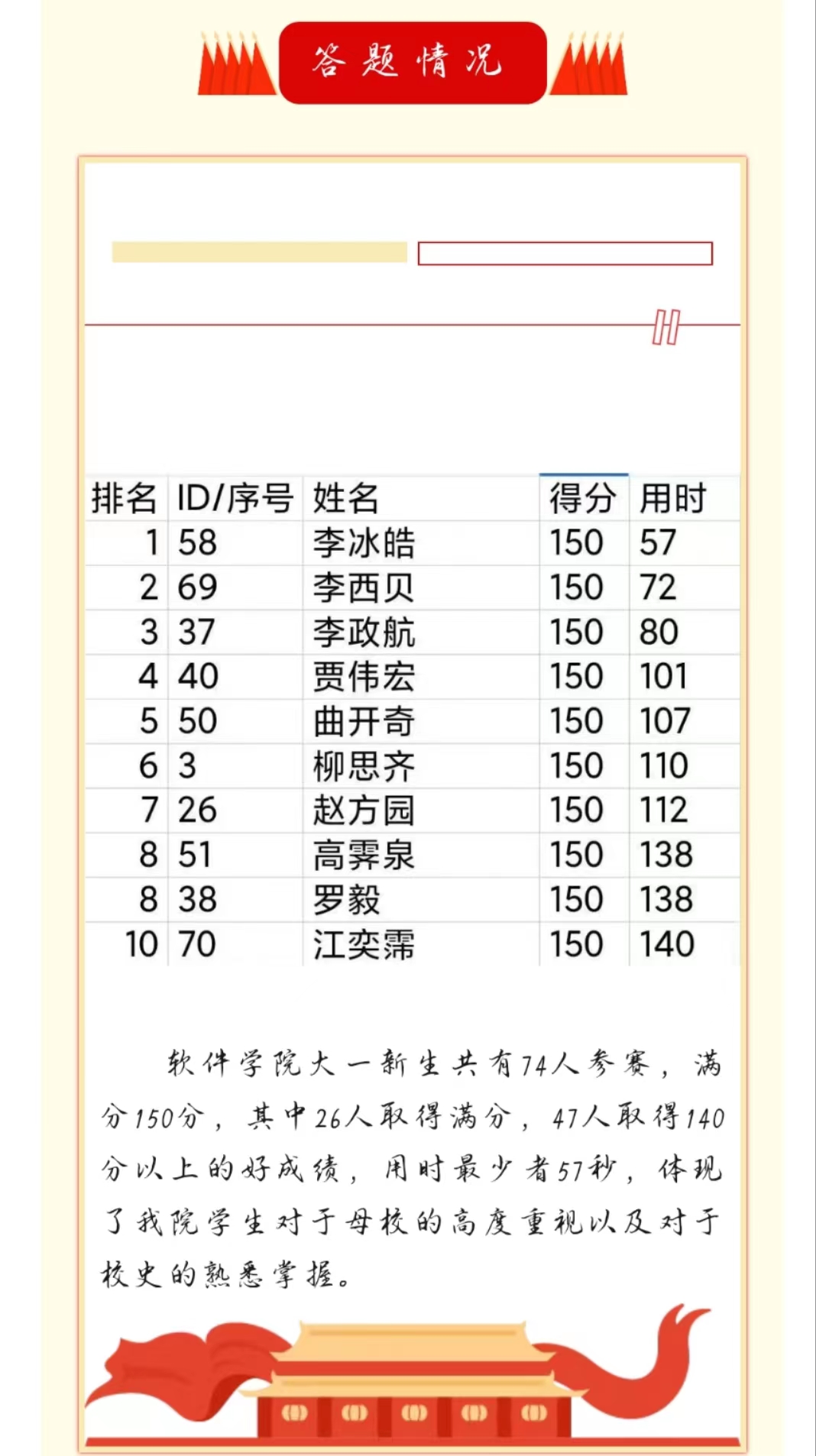 的发展历程和概况,为比赛做好了充足的准备。在比赛过程中,同学们反应迅速,精准作答,展现出对校史知识的熟练掌握和对母校的无限热爱。他们凭借对校史知识的深厚储备及出色的临场表现,赢得了现场观众的阵阵掌声。最终,共有26名同学取得了满分150分的好成绩,47名同学的得分超过了140分,答题最短用时仅57秒。赛后,许多同学表示,自己通过参与本次活动更真切地感受到17吃瓜网