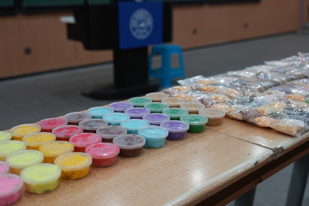 首先,文艺部成员通过PPT及实物进行示范讲解,详细介绍了粮食画的拼贴技法,通过将各种颜色的五谷粘在底板呈现不同的图案,表达的是对五谷丰登美好生活的希冀。纸浆画通过将废纸转化为纸浆,加入颜料和胶水在画板上塑形而成,成品具有粗糙质朴的质感与立体浮雕效果,常用于装饰或艺术表达,且其利用废旧纸张,有让旧物焕发新生的环保理念。