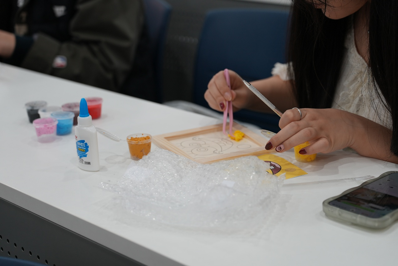 掌握制作方法后,学生们纷纷动手创作。粮食画组的学生们细致构思,将一粒粒色彩各异的谷物巧妙拼接,勾勒出星空、卡通形象等灵动画面,让平凡的粮食焕发出别样的艺术生机。纸浆画组的学生们以手为笔、以浆为墨,在画板上层层铺浆塑形,创作出栩栩如生的花卉、意境悠远的山峦等作品,尽显巧思。三个小时的创作过程中,现场氛围安静温馨、秩序井然,大家沉浸在手工乐趣中,在动手实践中感受传统技艺之美、体悟环保理念。