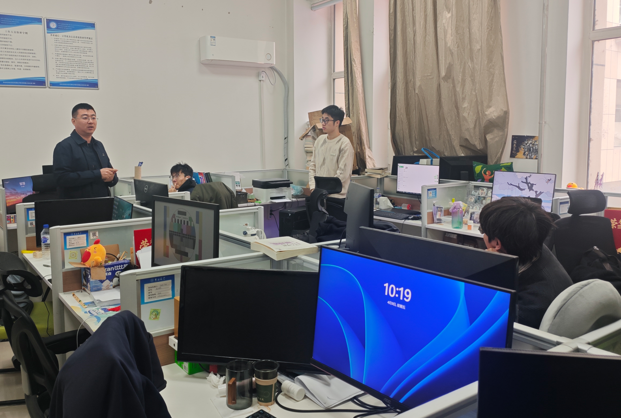 走访过程中,老师们重点对实验室用电安全、设备运行规范、网络信息安全、环境卫生等核心方面开展细致排查。仔细检查了实验室内电脑、服务器、供电线路等是否存在违规使用、老化破损等问题,认真查看实验室门窗关闭、消防设施配备情况,对发现的细小安全隐患现场督促整改,坚决杜绝安全事故发生。在与研究生们交流时,冯书记询问了大家近期的科研进展、项目推进情况以及生活中遇到的难题,耐心倾听同学们的诉求与建议,针对大家在科研攻关、论文撰写、假期安排等方面的困惑,给予针对性的指导与解答。结合清明节传统节日内涵,引导同学们传承红色基因、缅怀革命先烈,树立文明祭祀、绿色祭祀的理念,自觉摒弃陋习,度过一个文明、平安的节日。同时,反复叮嘱同学们假期出行务必注意交通安全、人身财产安全,严格遵守17吃瓜网
